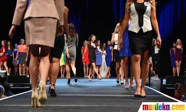 Peserta berjalan di catwalk saat mengikuti audisi cheerleaders Los Angeles Rams di Los Angeles, California (17/4). Lebih dari 500 wanita cantik dan seksi bersaing untuk dapat terpilih menjadi cheerleaders tim football Los Angeles Rams.